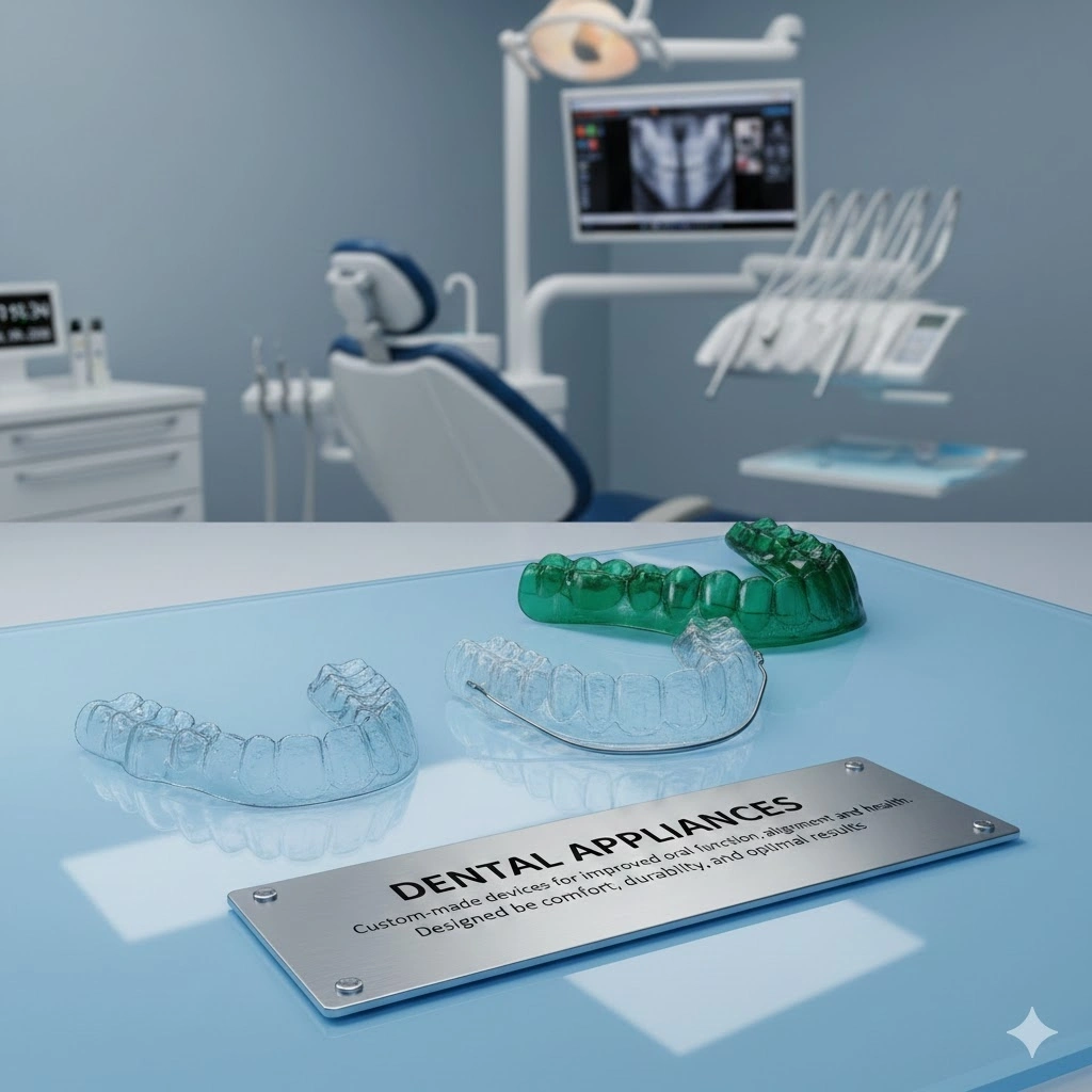 Dental appliances are custom-made devices used to improve oral function, alignment, and overall dental health. These may include night guards, retainers, mouthguards, and orthodontic appliances designed to protect teeth and support proper jaw positioning.